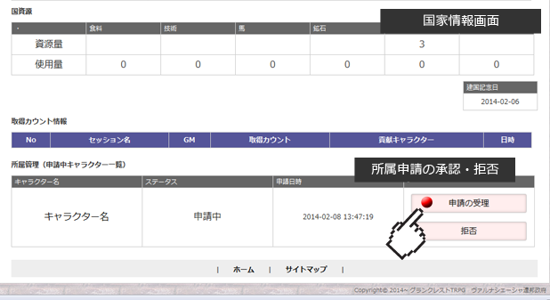 国家を保有するキャラクターは、未所属(ヴァルナシェーシャ連邦直属)のキャラクターから、所属申請を受ける場合があります。